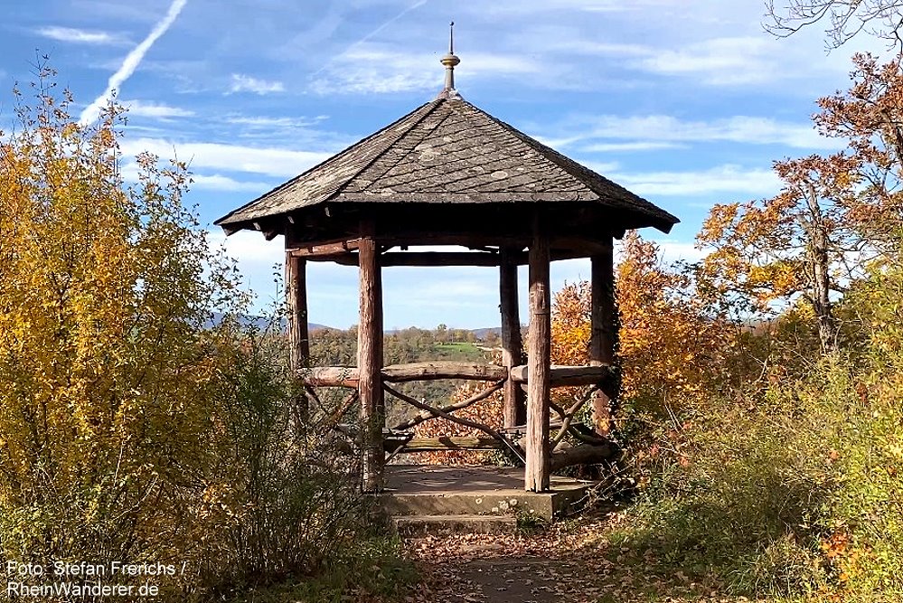 Kurz danach gelangt man dann über eine dritte Abzweigung nach links zum sogenannten Aussichtstempel – einem kleinen Pavillon, von dem aus man rheinabwärts direkt auf den Loreleyfelsen blickt.